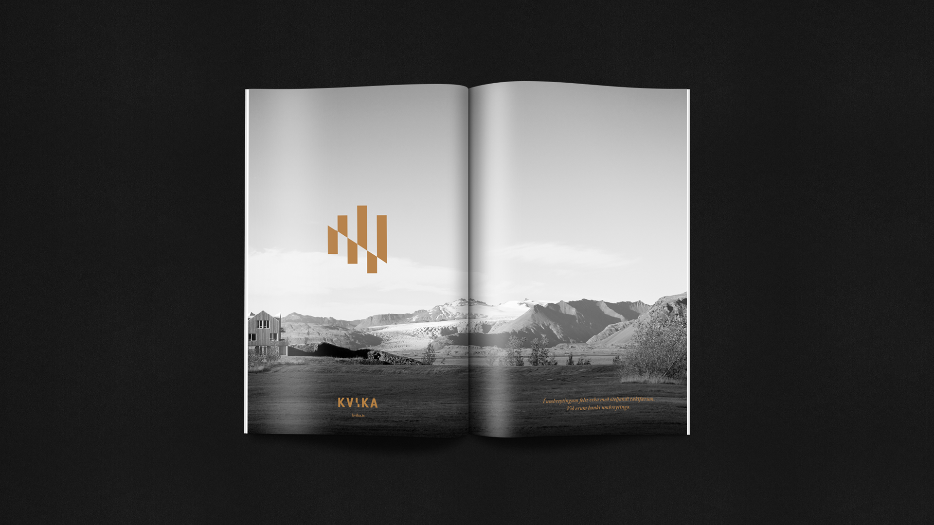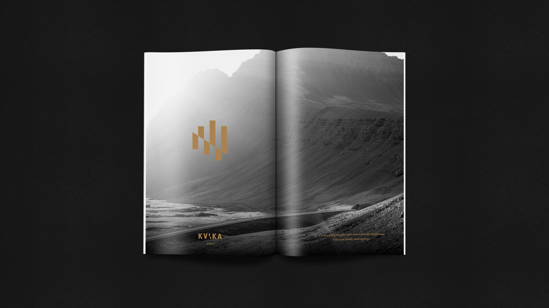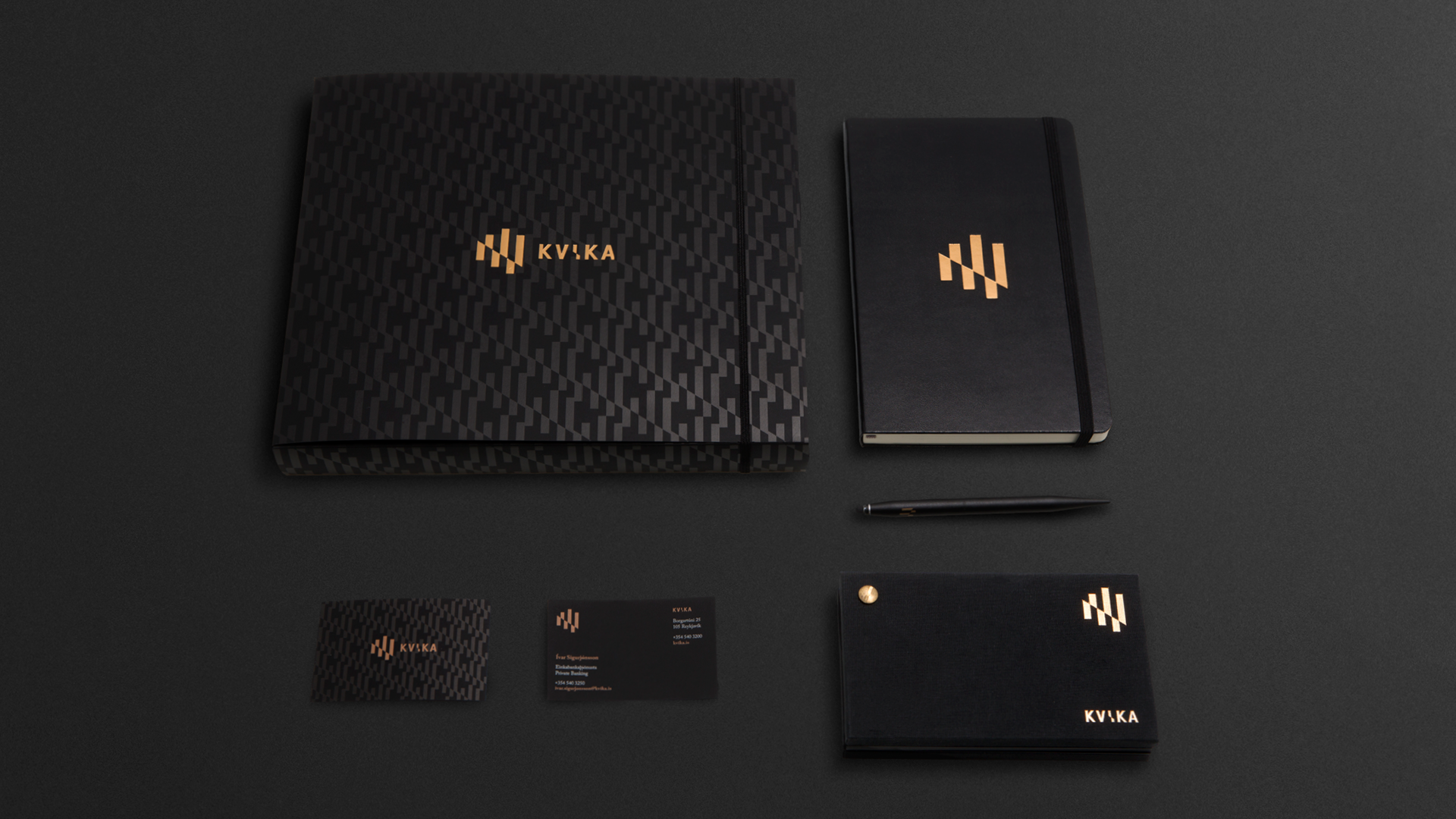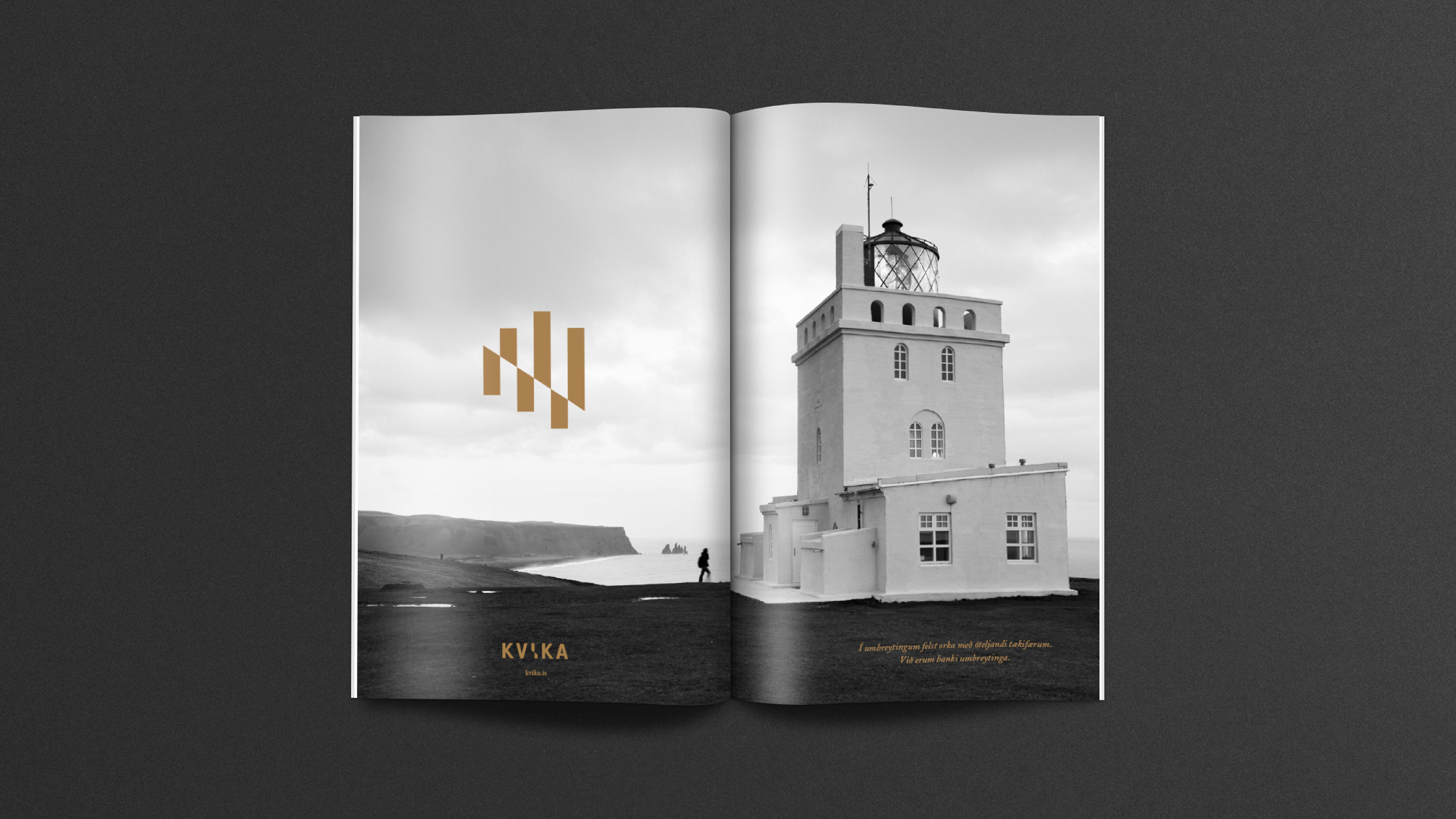 Sameining tveggja stórra aðila á fjárfestingarbankasviði opnaði tækifæri til að móta nýja nálgun í bankaviðskiptum. Þróuð var nálgun fyrir bankann sem umbreytingarafl og hún studd af okkar hálfu með hönnunarheimi sem gerði viðskiptavinum og samstarfsaðilum ljóst fyrir hvað bankinn stóð og hvað það þýddi að vera hluti af hans samstarfsheimi. Gengið var út frá því að upplifun viðskiptavina yrði meiri í gegnum ásýnd bankans og áþreifanlega umgjörð en ella. Allt frá nafni bankans til raddar á símsvara, frá prentgripum til rafræns heims og frá auglýsingum til innanrýmis bankans var hannað út frá þessari grunnhugmyndafræði. Nafn og merki Kviku ásamt allri grunnhönnun var unnin af hönnuðum okkar en þess fyrir utan áttum við í gríðar góðu samstarfi með Hafsteini Júlíussyni innanhúss- og iðnhönnuði og hans fólki í HAF studioi og ljósmyndaranum Marínó Thorlacius sem aðstoðuðu okkur að framkvæma þá ásjónu sem samræmdist okkar hugmyndafræði.