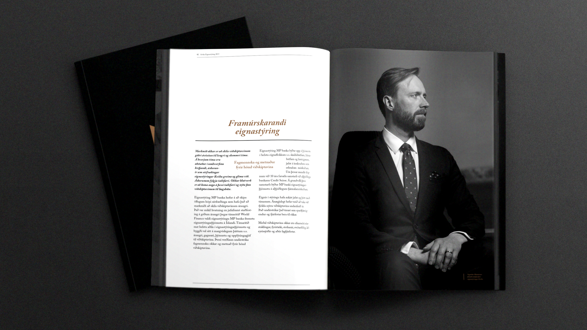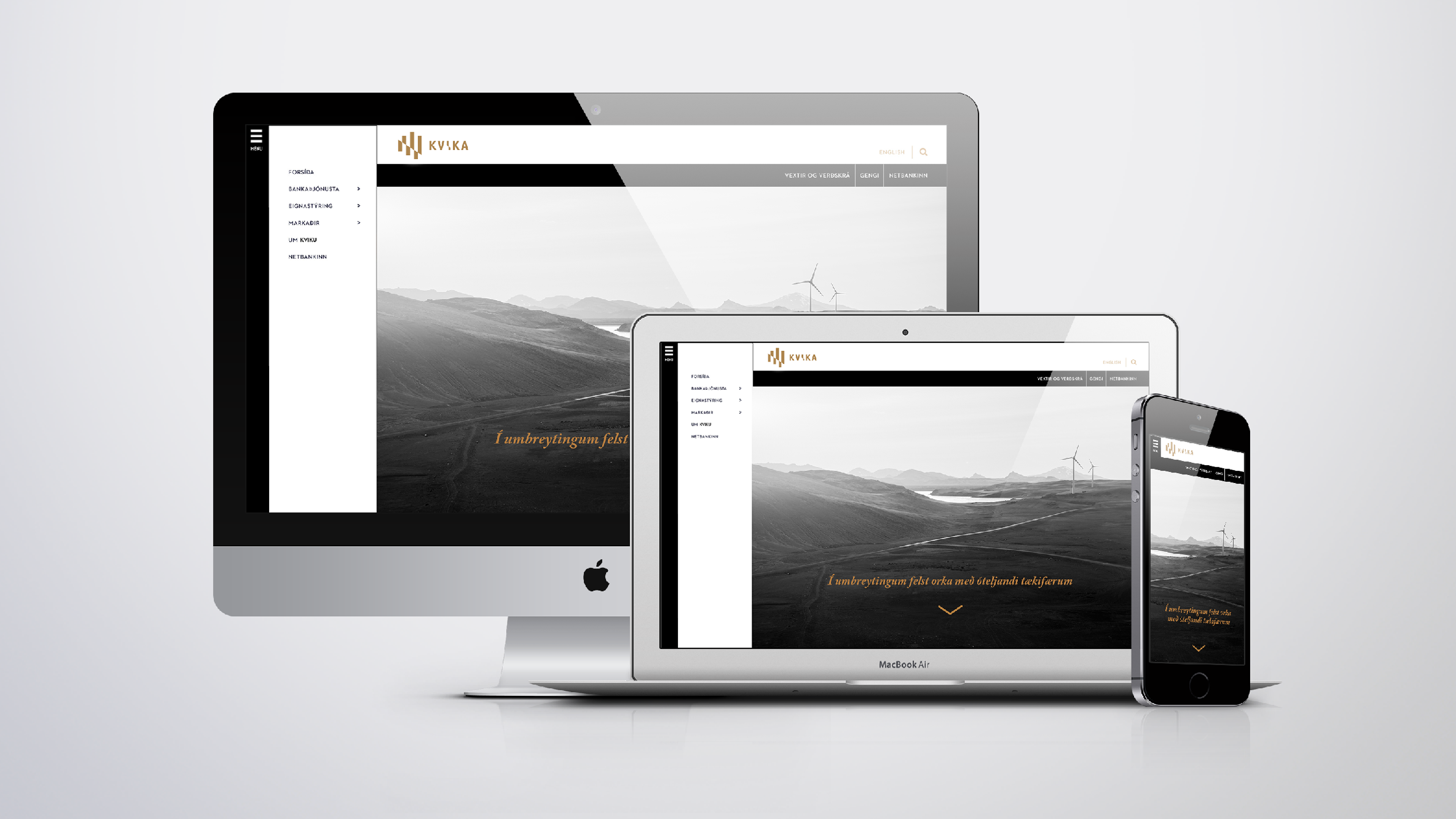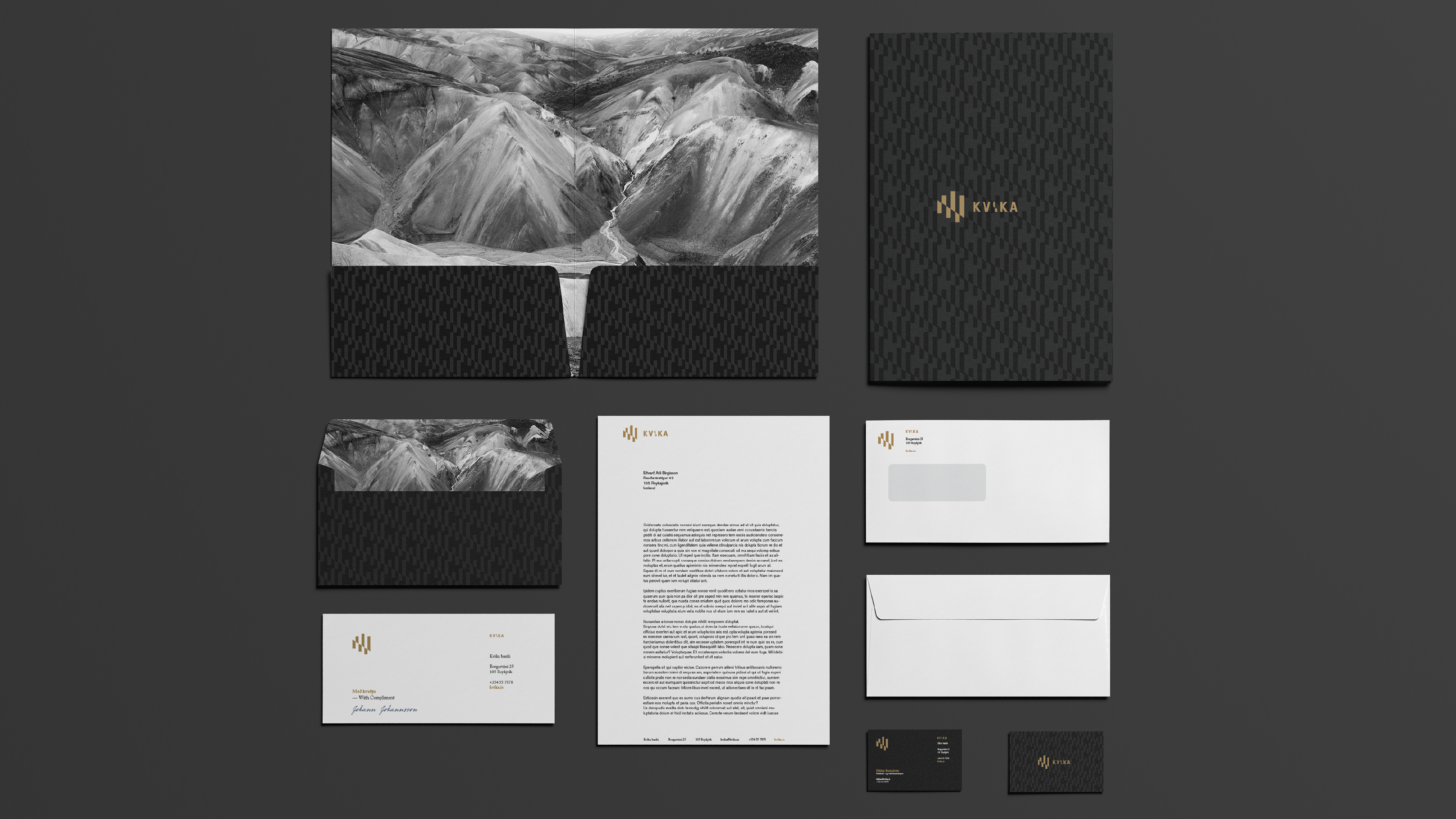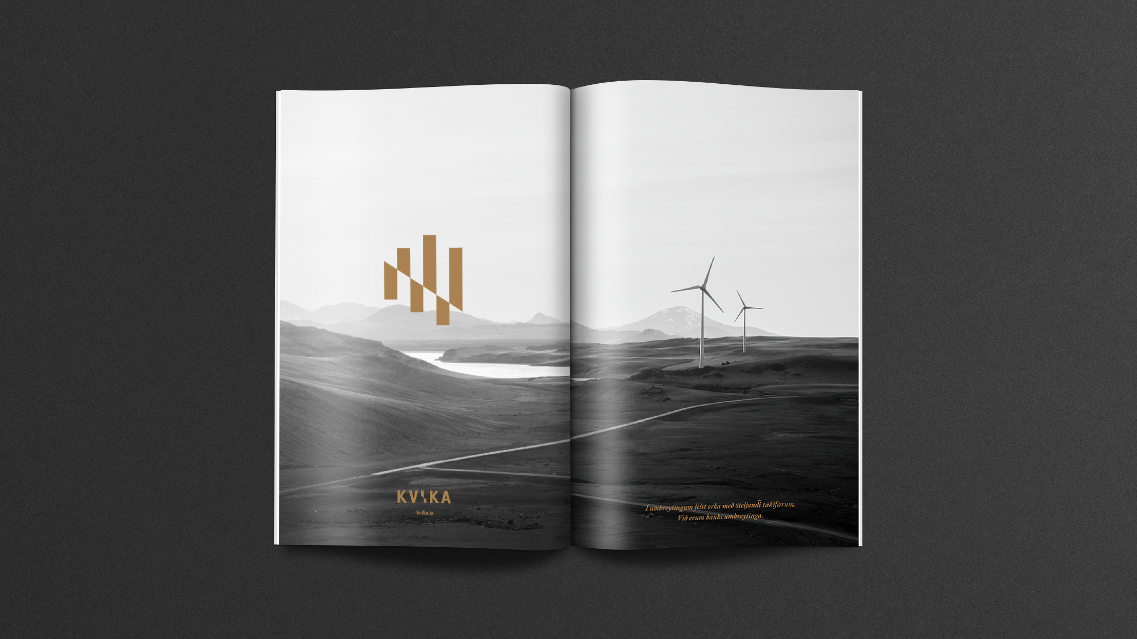 Sameining tveggja stórra aðila á fjárfestingarbankasviði opnaði tækifæri til að móta nýja nálgun í bankaviðskiptum. Þróuð var nálgun fyrir bankann sem umbreytingarafl og hún studd af okkar hálfu með hönnunarheimi sem gerði viðskiptavinum og samstarfsaðilum ljóst fyrir hvað bankinn stóð og hvað það þýddi að vera hluti af hans samstarfsheimi. Gengið var út frá því að upplifun viðskiptavina yrði meiri í gegnum ásýnd bankans og áþreifanlega umgjörð en ella. Allt frá nafni bankans til raddar á símsvara, frá prentgripum til rafræns heims og frá auglýsingum til innanrýmis bankans var hannað út frá þessari grunnhugmyndafræði. Nafn og merki Kviku ásamt allri grunnhönnun var unnin af hönnuðum okkar en þess fyrir utan áttum við í gríðar góðu samstarfi með Hafsteini Júlíussyni innanhúss- og iðnhönnuði og hans fólki í HAF studioi og ljósmyndaranum Marínó Thorlacius sem aðstoðuðu okkur að framkvæma þá ásjónu sem samræmdist okkar hugmyndafræði.